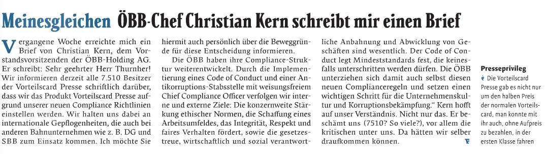 Im neuen Falter mokiert sich mein Lieblings-Chefredakteur Armin Thurnher über einen Brief von ÖBB-Chef Christian Kern zur Abschaffung der „Vorteilscard Presse“: Die gab es für Journalisten bisher zum halben Preis der normalen Vorteilscard und mit dem Privileg, ohne Aufpreis 1. Klasse zu fahren. Als was immer das gedacht war (Bestechung?) – diese Gunstbezeugung wird wohl kaum das Erscheinen ÖBB-kritischer Berichte verhindert haben. Denn jeder mit einem Presseausweis konnte sich diese Karte besorgen, 7.510 Personen haben das auch getan, und trotzdem haben die ÖBB keine wirklich gute Presse.