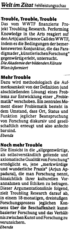 Die Wiener Stadtzeitung Falter hält das Interesse der geneigten Leserschaft nicht nur mit häufigen und für die Betroffenen zu Recht peinlichen Enthüllungen wach – es gibt dort auch eine Reihe regelmäßiger Kolumnen, von denen jede ihre treuen Fans pflegt. Mein Favorit ist die Fehlleistungsschau „Welt im Zitat“, weil ich dort wöchentlich vor Augen geführt bekomme, wie bitter nötig bessere Texter wären… selbst bei Einrichtungen wie der Akademie der bildenden Künste Wien. Lesen Sie mal das!